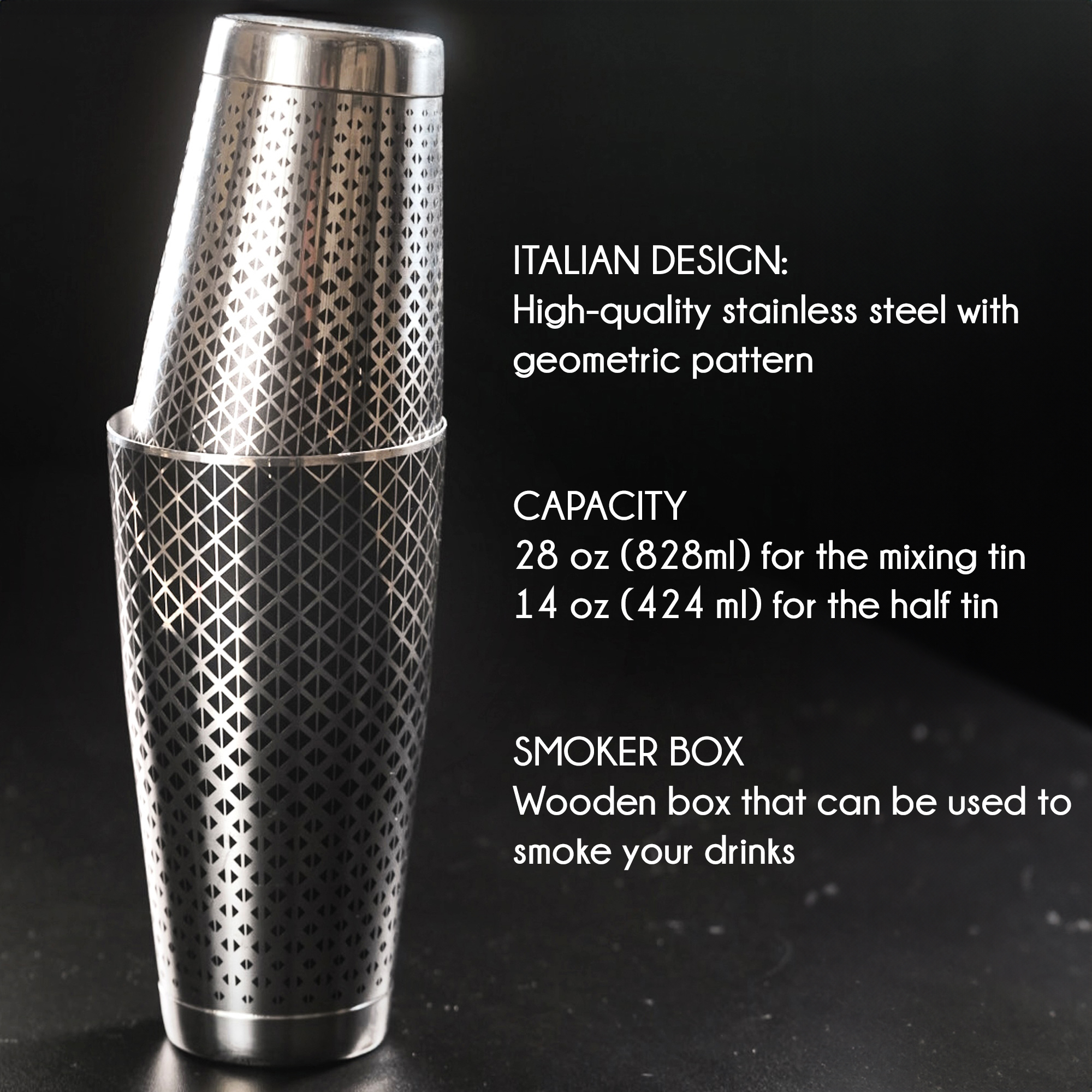 Feature Detail Material Food-grade 304 stainless steel Finish Black metallic with geometric texture Mixing tin capacity 828 ml (28 oz) Half tin capacity 424 ml (14 oz) Box dimensions Standard with smoking port Recommended cleaning Hand wash to preserve finish