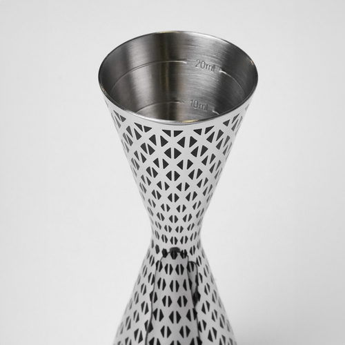 La parte superiore offre 30 ml con tacche interne a 10 e 20 ml, mentre la parte inferiore permette dosaggi da 60 ml con tacche a 45 e 30 ml. Questa doppia funzionalità consente di misurare con precisione anche le ricette più complesse. - Texture Geometrica al Laser: